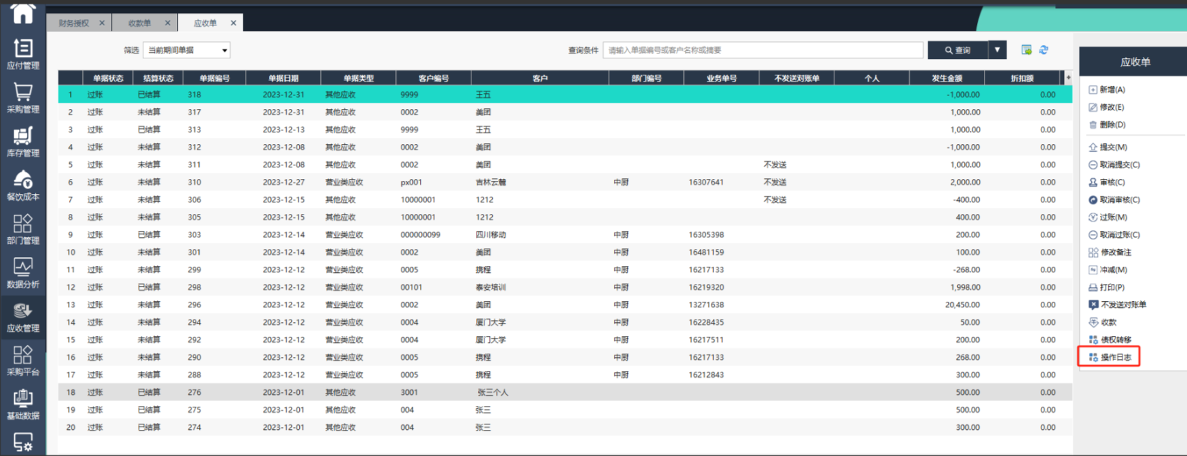 1、点击[日常业务-应收单]主功能菜单,即可进入应收单主界面 2、点击[操作日志]