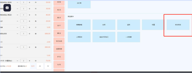 业务说明:对可编辑菜名的菜品,当点菜员输入菜名后,发现菜名打错,要修改菜名,可用该功能进行修改,前提是该菜还没有落单或打印过。操作步骤:1、进入落单收银界面,选择某条点菜记录2、在“更多”功能选择“修改菜名”,即可以修改菜名