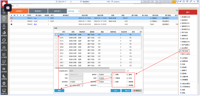点击预订排房,勾选需要筛选的房间状态后点击查询,选择需要安排的房间,确认即可。